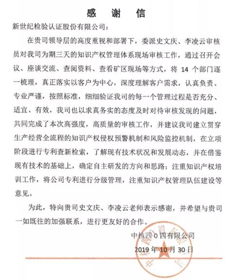 四O四對認(rèn)證審核工作高度重視、積極配合,順利通過知識產(chǎn)權(quán)管理體系的認(rèn)證審核,證書認(rèn)證范圍是:與核燃料的加工,核設(shè)施退役相關(guān)的知識產(chǎn)權(quán)管理。在征得公司同意之后,BCC將四O四作為優(yōu)秀貫標(biāo)案例向國家知識產(chǎn)權(quán)局進(jìn)行了推薦。