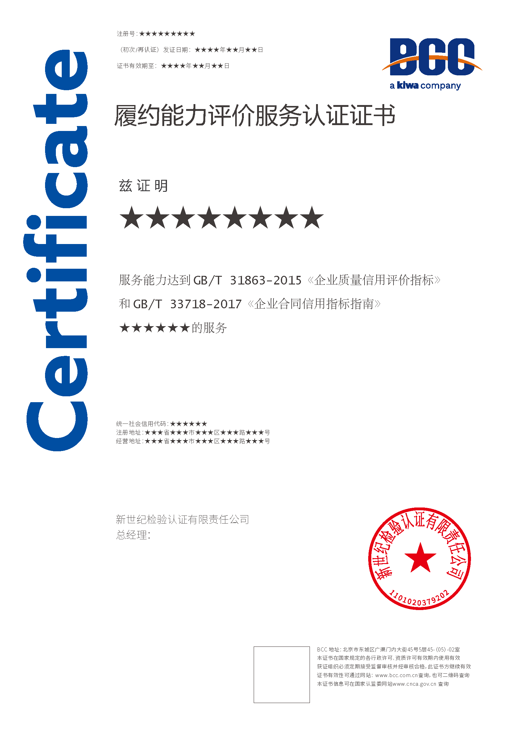 認(rèn)證依據(jù)為:GB/T 31863-2015 《企業(yè)質(zhì)量信用評價(jià)指標(biāo)》和 GB/T 33718-2017 《企業(yè)合同信用指標(biāo)指南》。