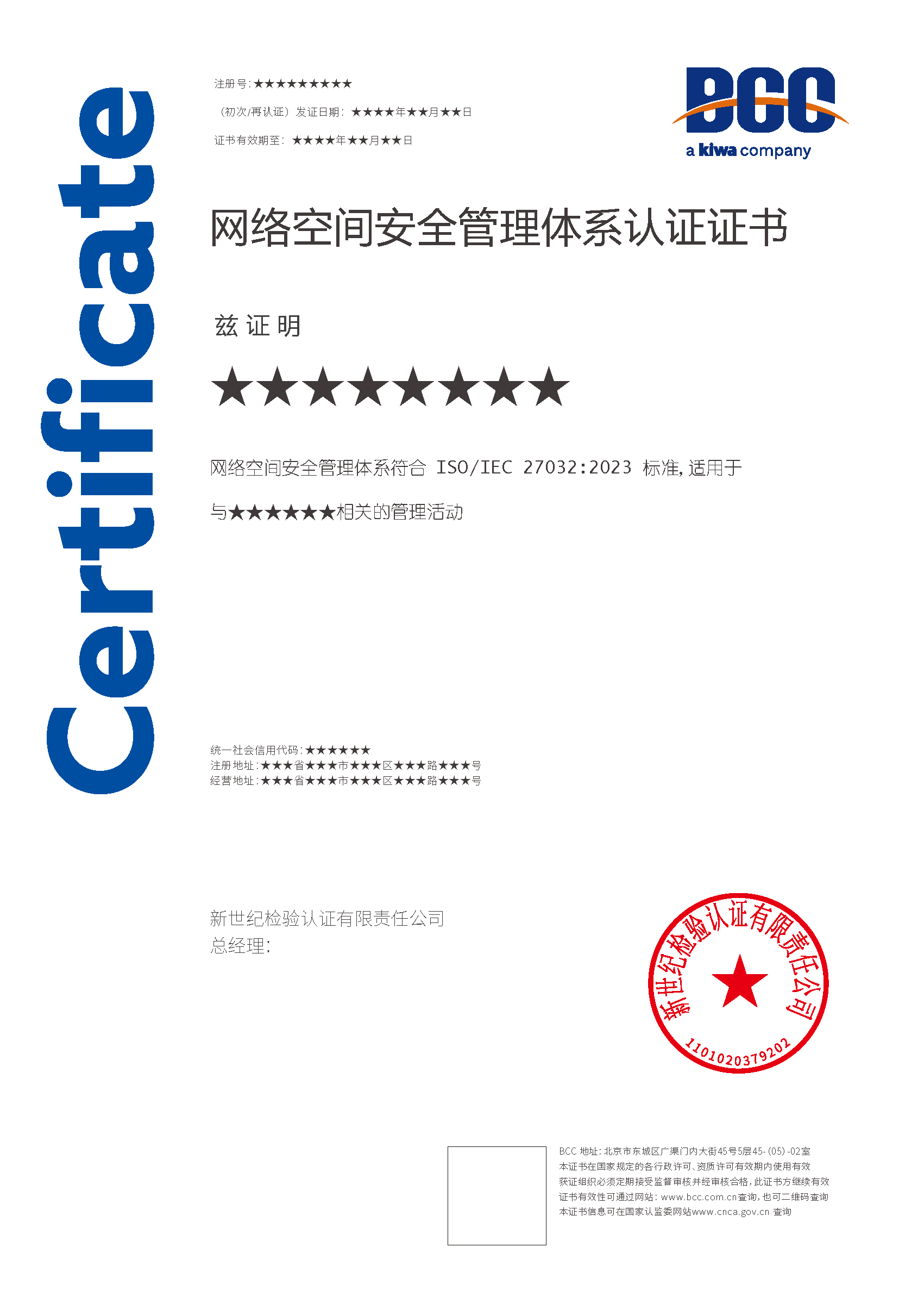 本頁涉及的認證服務中均有對應的《認證實施規(guī)則》,BCC擁有其最終解釋權。任何組織及個人未經BCC許可,不得以任何形式全部或部分使用(法律要求除外)認證相關信息。如需獲取相關實施規(guī)則請用以下方式聯系獲取:電話:010-58579316   郵箱:fwjs@kiwa.cn