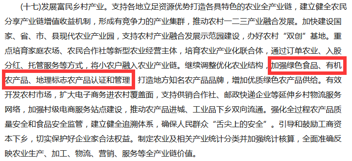 文件中的第十七點,提到了“加強綠色食品、有機農產品認證和管理”