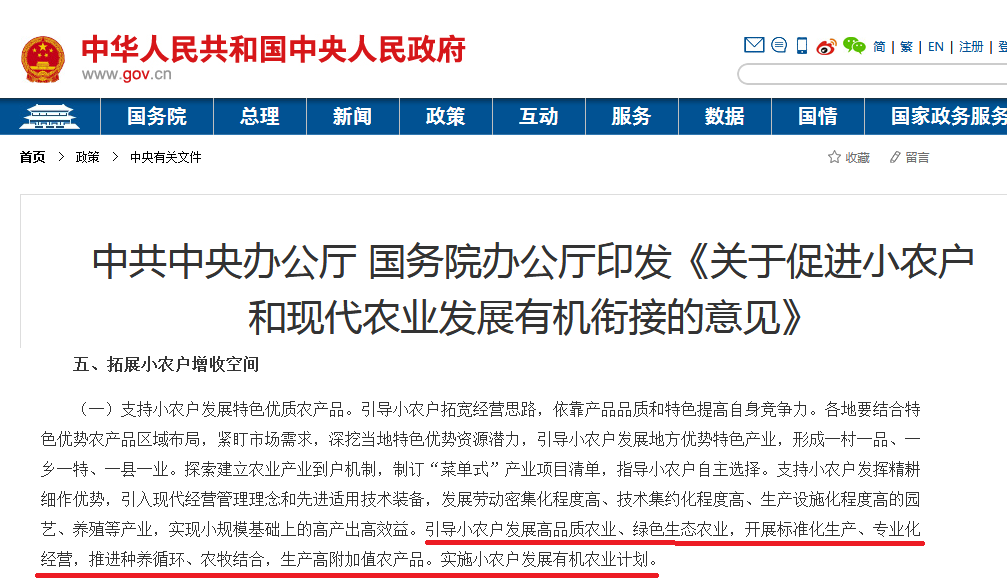 其中意見描述:“引導小農戶發(fā)展高品質農業(yè)、綠色生態(tài)農業(yè),開展標準化生產、專業(yè)化經(jīng)營,推進種養(yǎng)循環(huán)、農牧結合,生產高附加值農產品。實施小農戶發(fā)展有機農業(yè)計劃。”