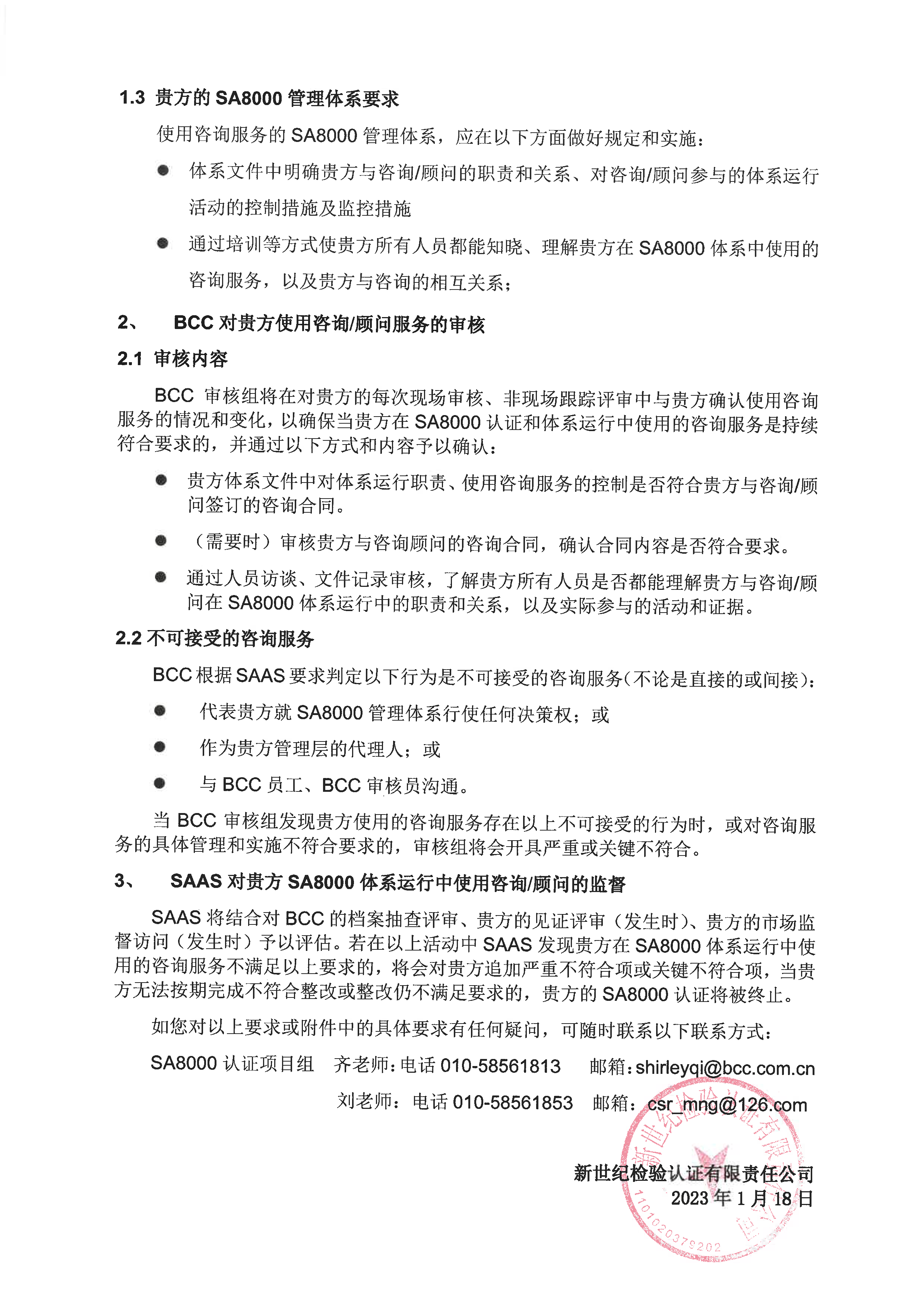 關(guān)于在SA8000體系認(rèn)證中使用咨詢?nèi)藛T的告客戶書