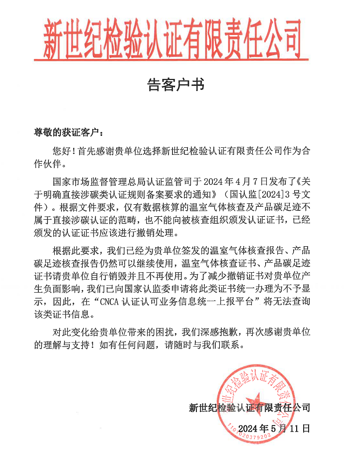關(guān)于涉碳認證情況告客戶書